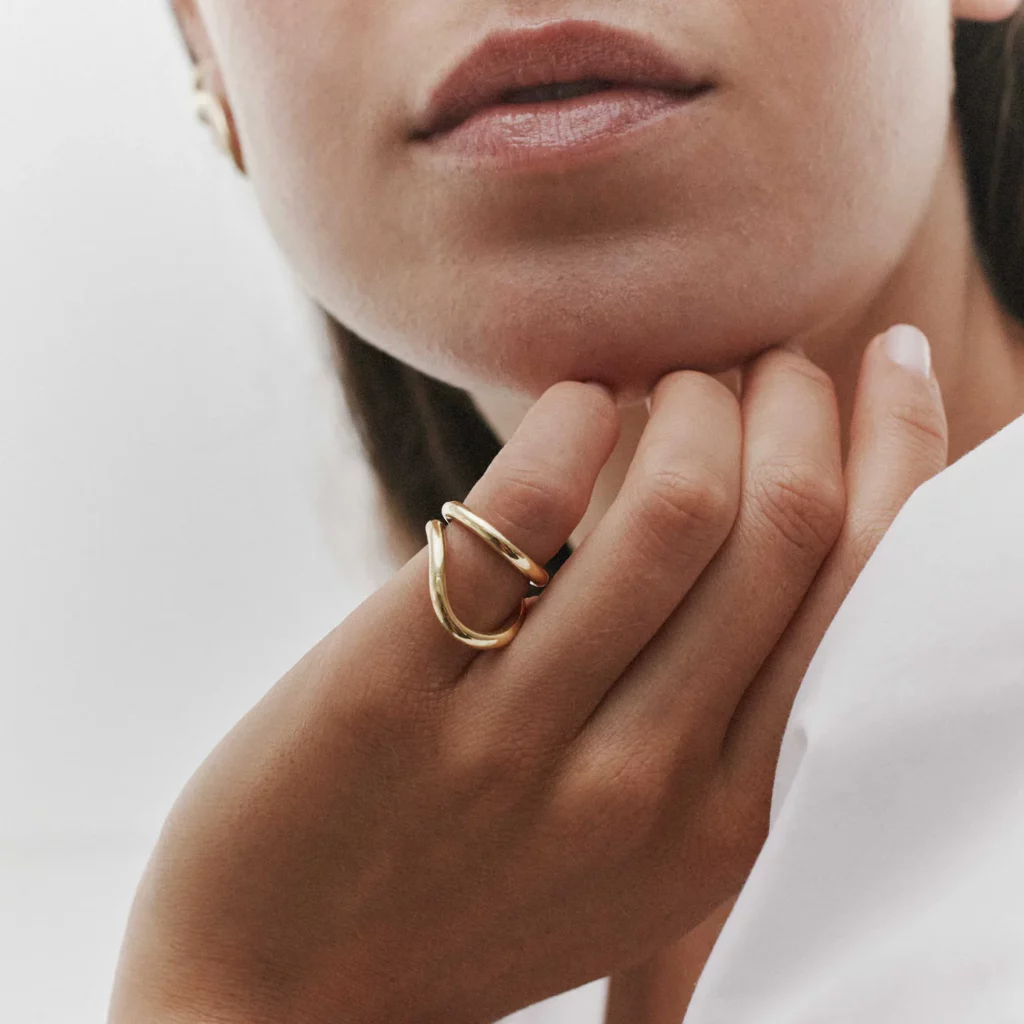 Quand je cherche un bijou à offrir, j’essaie souvent de privilégier des pièces simples, bien dessinées, que l’on peut porter longtemps. La bague Echo de Mayrena correspond bien à cette idée. La forme est très graphique, avec une ligne nette qui capte la lumière.