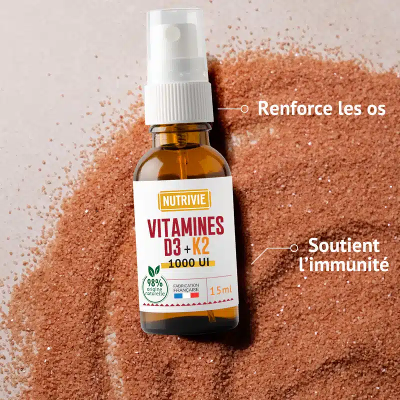 Le D3/K2, c’est un complément de fond pour l’hiver. Tout le monde en a besoin de septembre à avril en France. Deux sprays le matin, deux secondes, le flacon à côté de la cafetière.